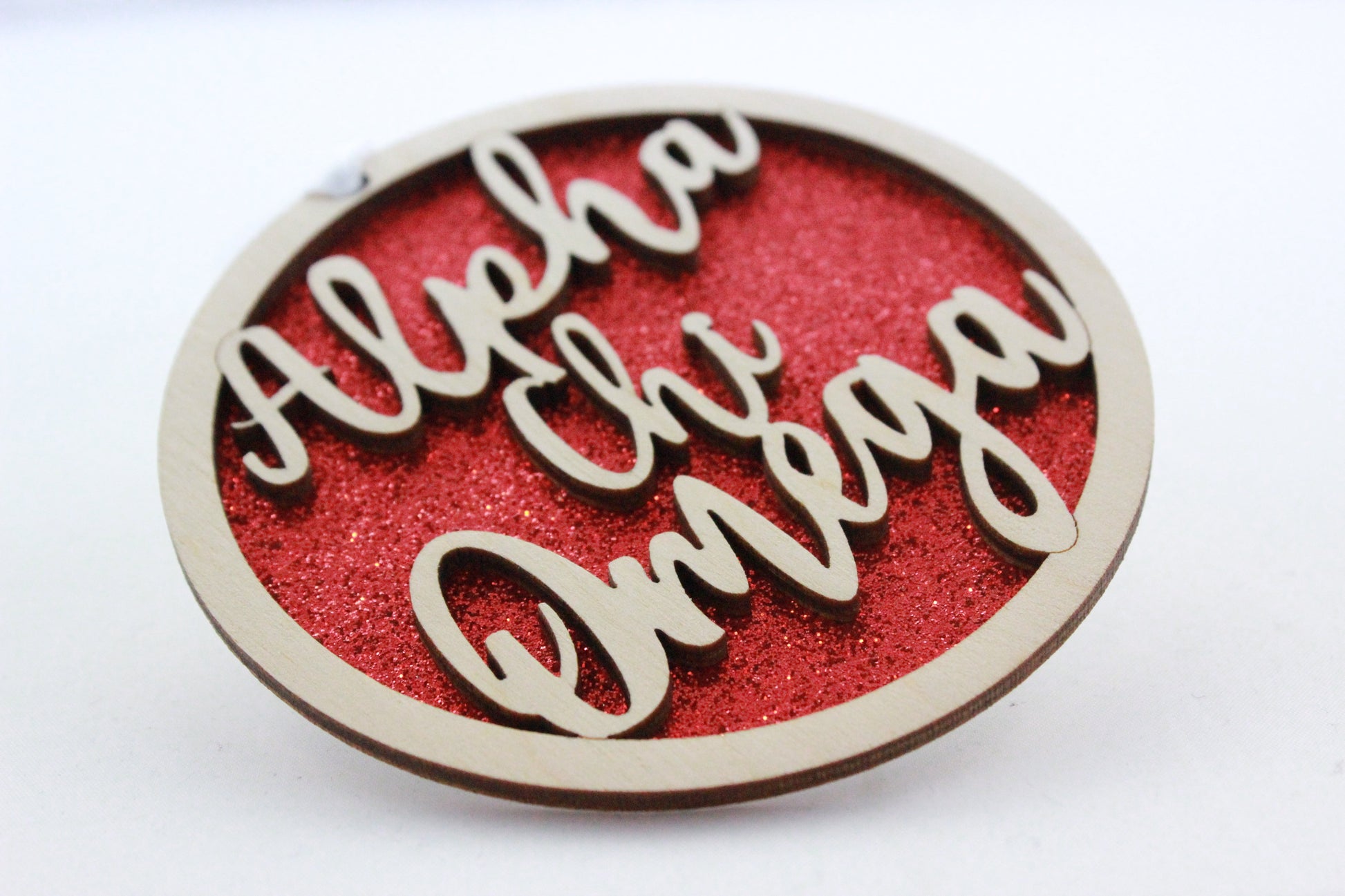 Available in Greek Letter or Script Name designs. These Ornaments are the perfect way to celebrate your Sorority Sisterhood. Laser carved out of wood and set against a sparkly background, they are guaranteed to get your spirit going. Perfect as a holiday decoration for home, dorm, or even your car!