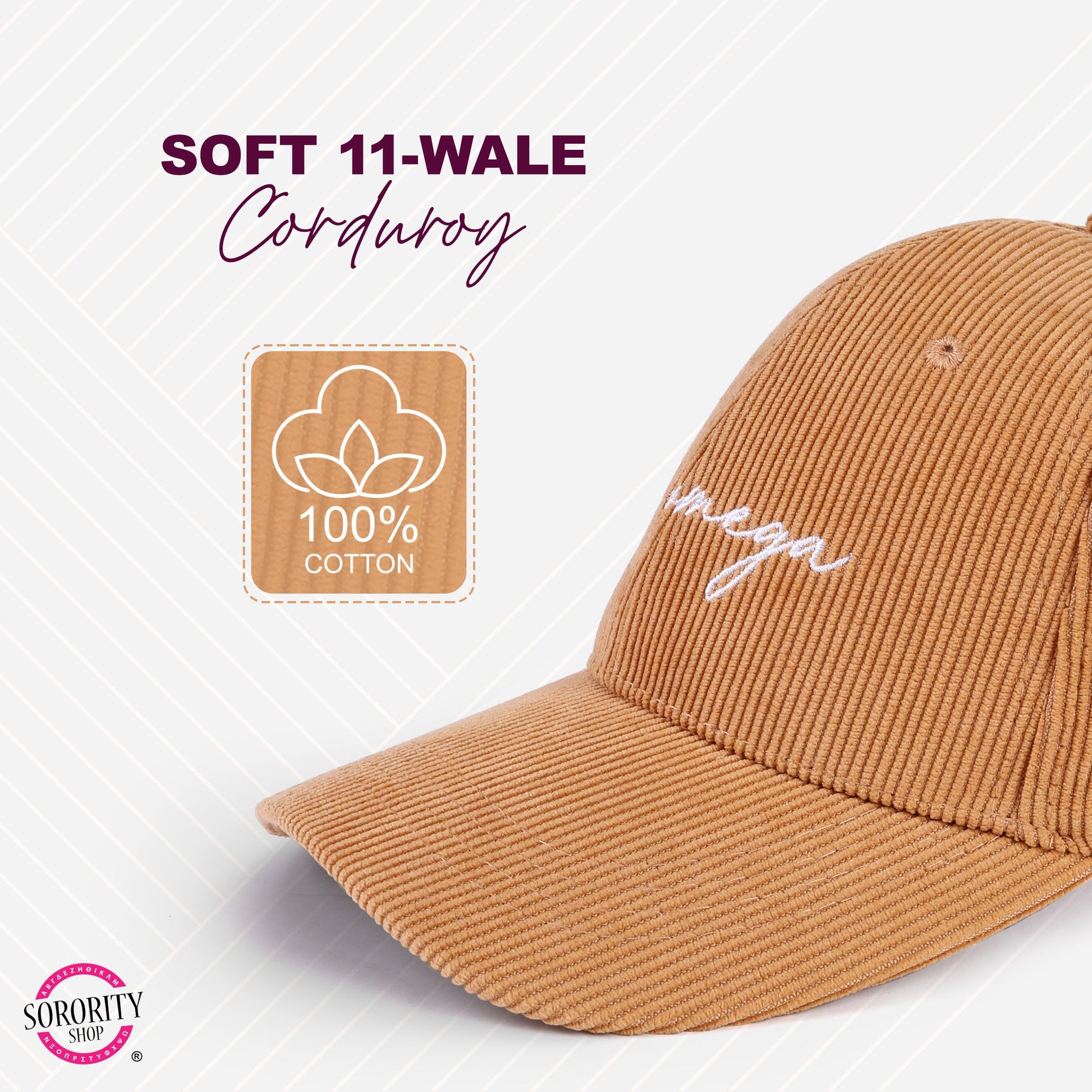 SOFT 11-WALE CORDUROY - Sorority Shop's baseball caps are developed from soft 11-wale corduroy, 100% cotton material. Breathable and stylish, this cap will be perfect for any season.