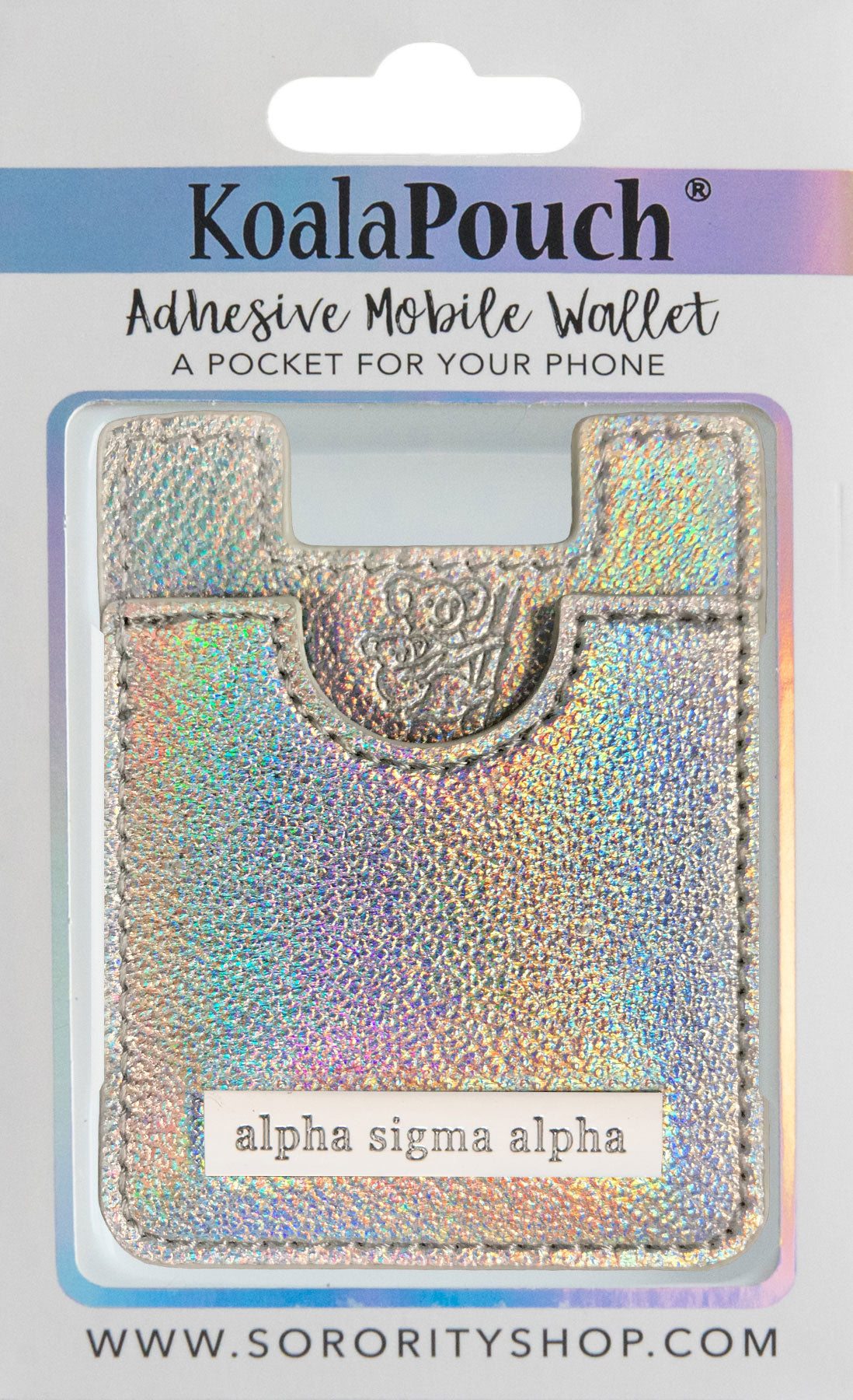 Show your sorority pride with the NEW Glitter Koala Pouch, adhesive cell phone wallet, the perfect solution for the multitasker on the go! Our NEW Koalas are made of faux leather and come in 3 styles: Gold Glitter, Pink Glitter and Holographic Finish. Each style has your organization’s name engraved on a high-gloss metal plate. Keep all of your valuables safe and secure in one place while reducing the amount of items you routinely carry. The Koala Pouch will securely hold up to 3 cards at a time and helps you with gripping your device as well.