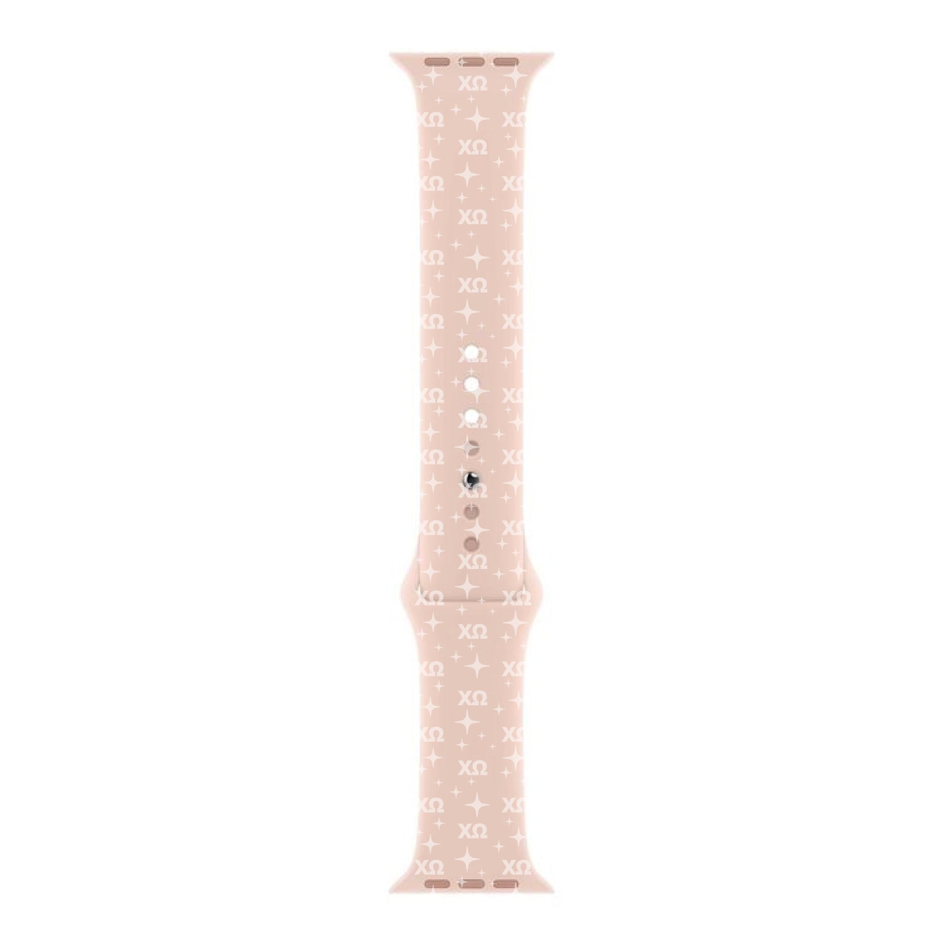 Represent Chi Omega sorority in style with our brand new Silicone Smart Watch Band! Each band is embossed with your sorority's letters and trendy repeating star pattern. Fully adjustable to your wrist size and easily cleaned due to the durable silicone, our watch band is the perfect accessory to wear year round. The best part? Our bands are the cutest shade of Millennial Pink!