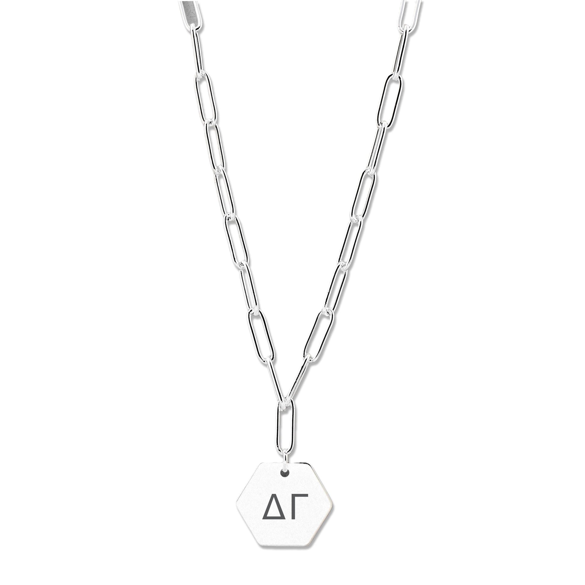 The perfect gift of Sisterhood! Our Delta Gamma Necklace features your sorority's Greek letters on a 15mm hexagon shaped pendant, with a paperclip style chain, all dipped in silver! Perfect for a bid day gift, big little gift or a treat for yourself!