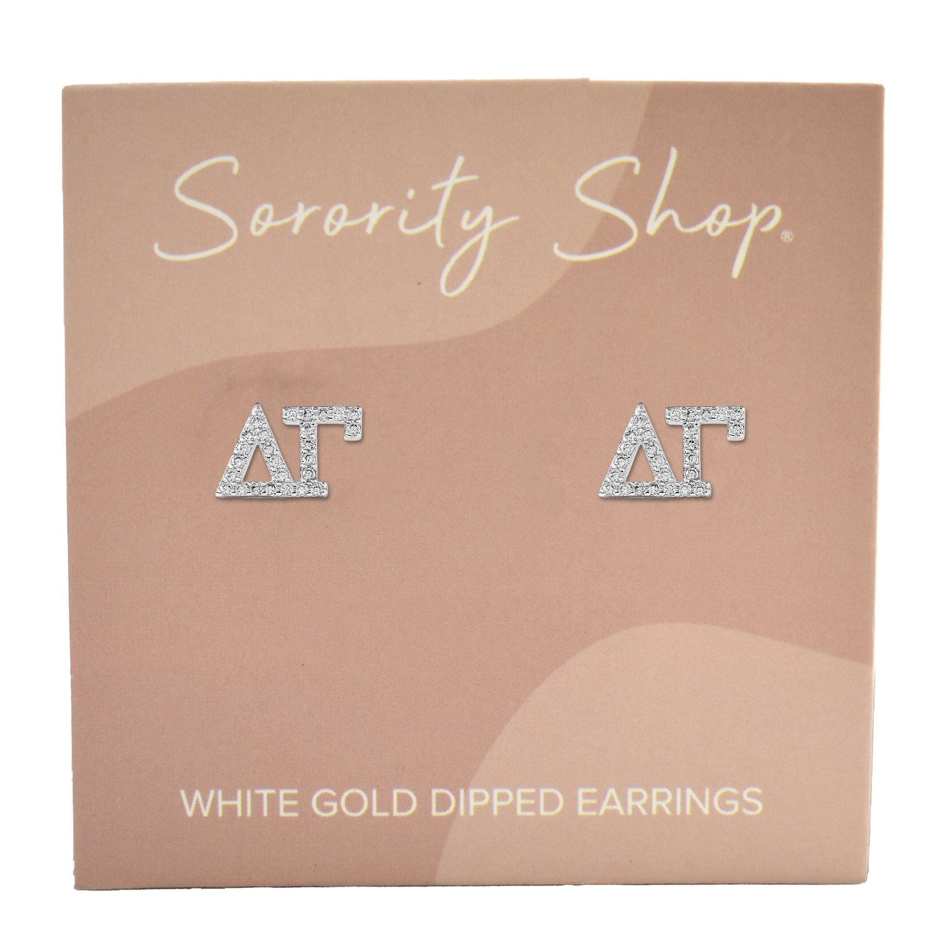 - STUD EARRING DESIGN – Our white gold-dipped Delta Gamma earrings are designed to make a statement. The Cubic Zirconia (CZ) studded sorority Greek letter earrings provide a unique look.