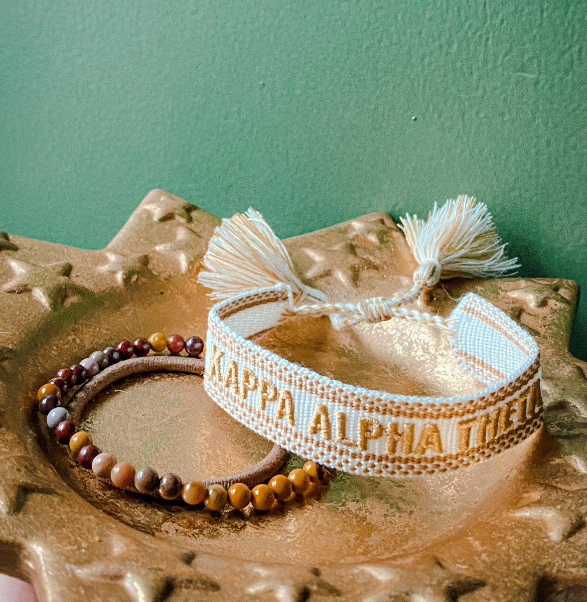 What sister doesn't want to represent her sorority in style? Modeled after your favorite designer bracelet, represent your sorority with our embroidered name bracelet. Our bracelet is one size fits all with adjustable sizing and is available in two different colors- black and white and gold and white!