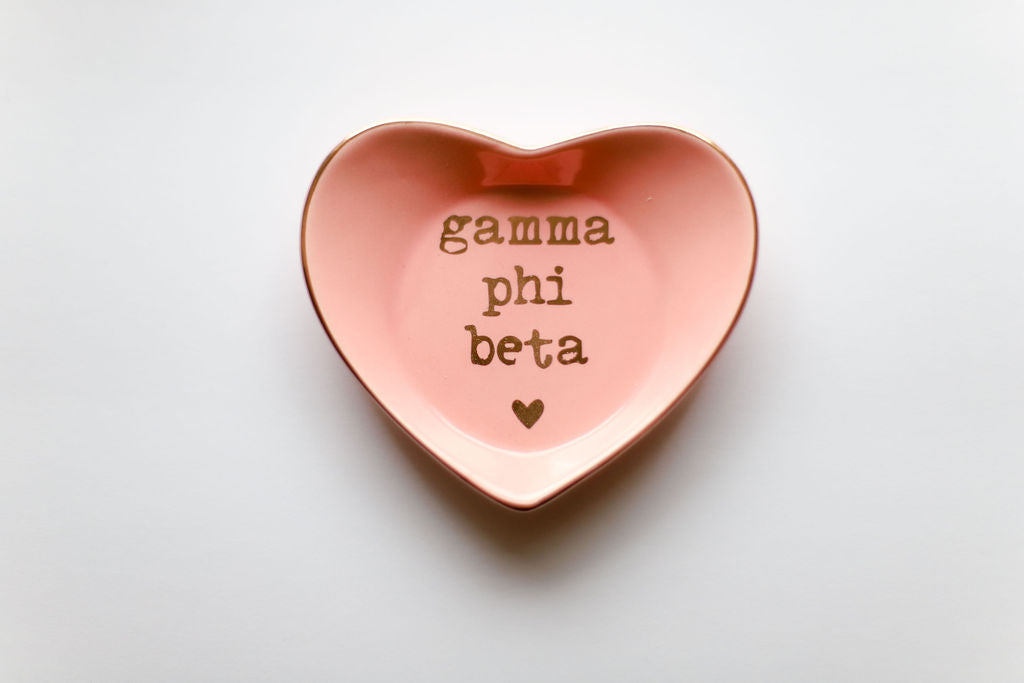 Our Gamma Phi Beta ceramic ring dish is the definition of chic with its high gloss finish and sorority name, heart and edge in gold. Great for rings, jewelry, keys or trinkets. Perfect for home or office!