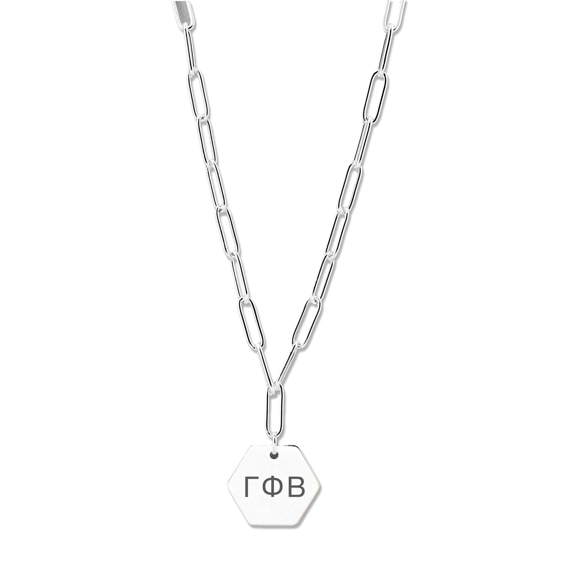 The perfect gift of Sisterhood! Our Gamma Phi Beta Necklace features your sorority's Greek letters on a 15mm hexagon shaped pendant, with a paperclip style chain, all dipped in silver! Perfect for a bid day gift, big little gift or a treat for yourself!