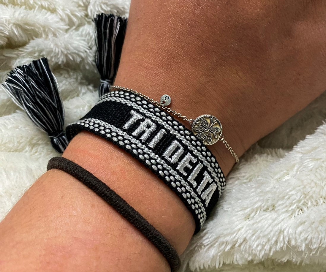 What sister doesn't want to represent her sorority in style? Modeled after your favorite designer bracelet, represent your sorority with our embroidered name bracelet. Our bracelet is one size fits all with adjustable sizing and is available in two different colors- black and white and gold and white!