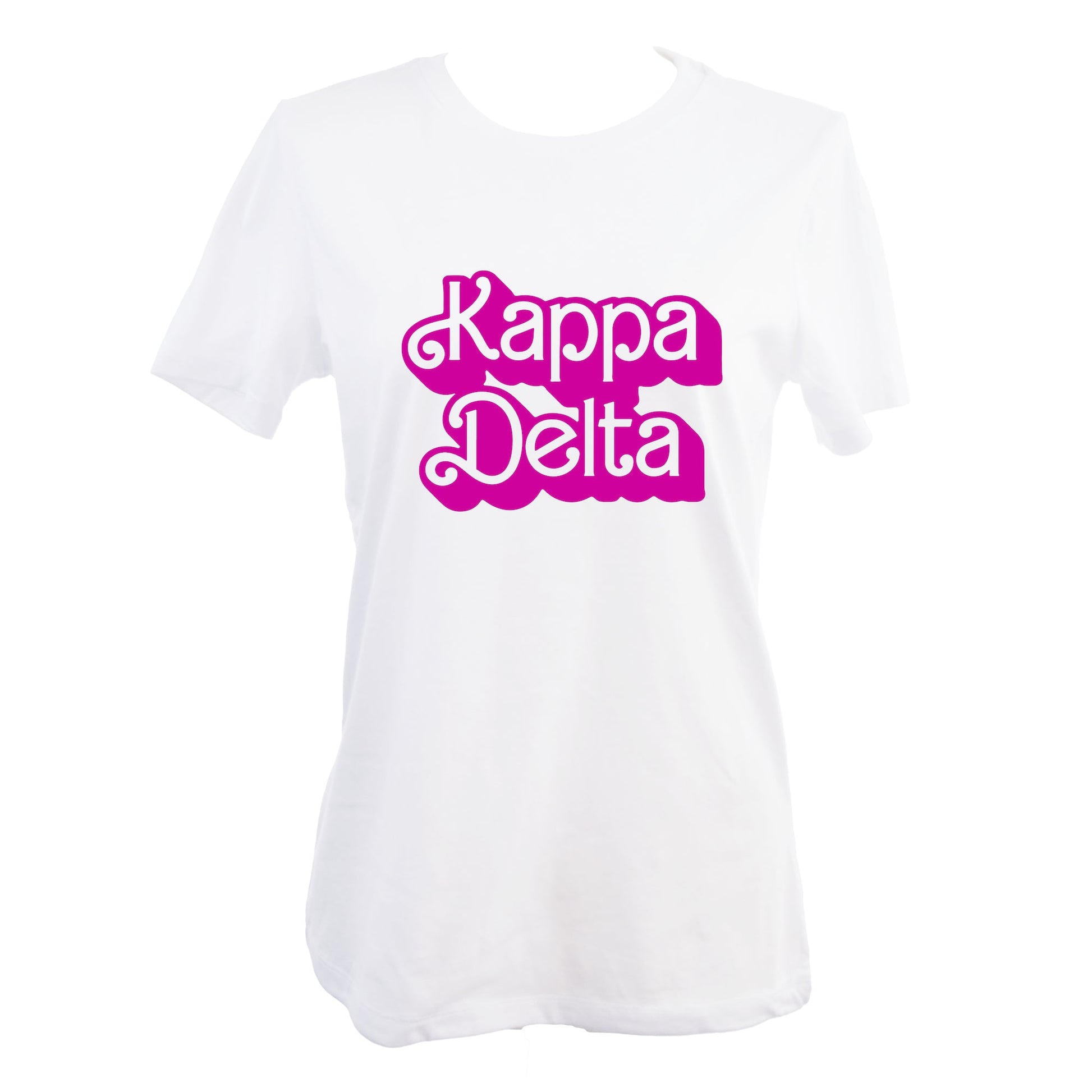 Our Kappa Delta Bella + Canvas women's relaxed fit solid white t-shirt is light weight and super soft, with a pink Retro Dolly font design.