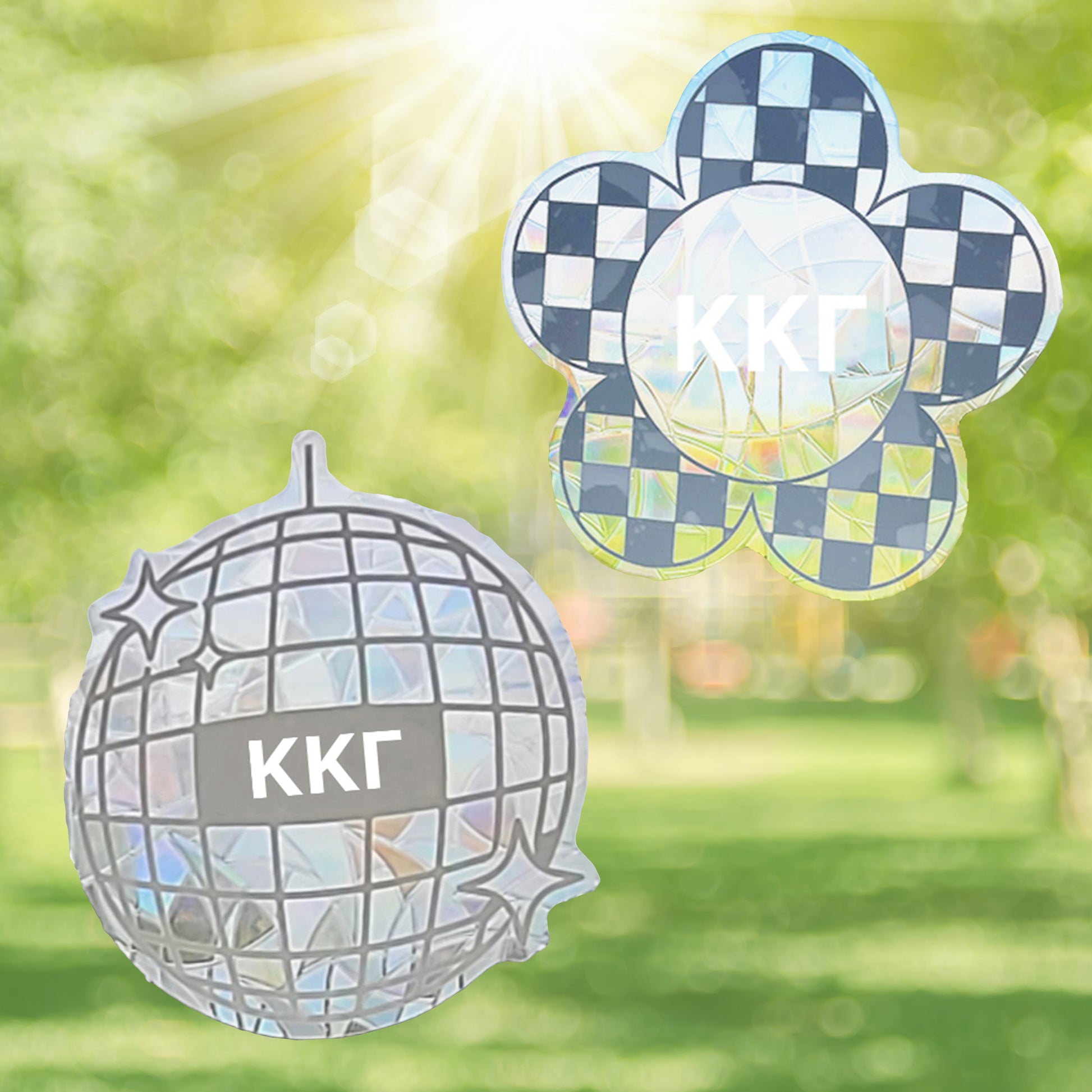 Our officially licensed Kappa Kappa Gamma suncatcher vinyl decals are custom-designed with each set including two beautiful window stickers: a flower and disco ball.
