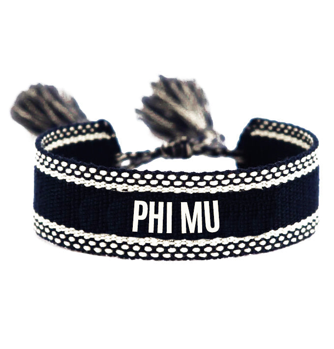 What sister doesn't want to represent her sorority in style? Modeled after your favorite designer bracelet, represent your sorority with our embroidered name bracelet. Our bracelet is one size fits all with adjustable sizing and is available in two different colors- black and white and gold and white!