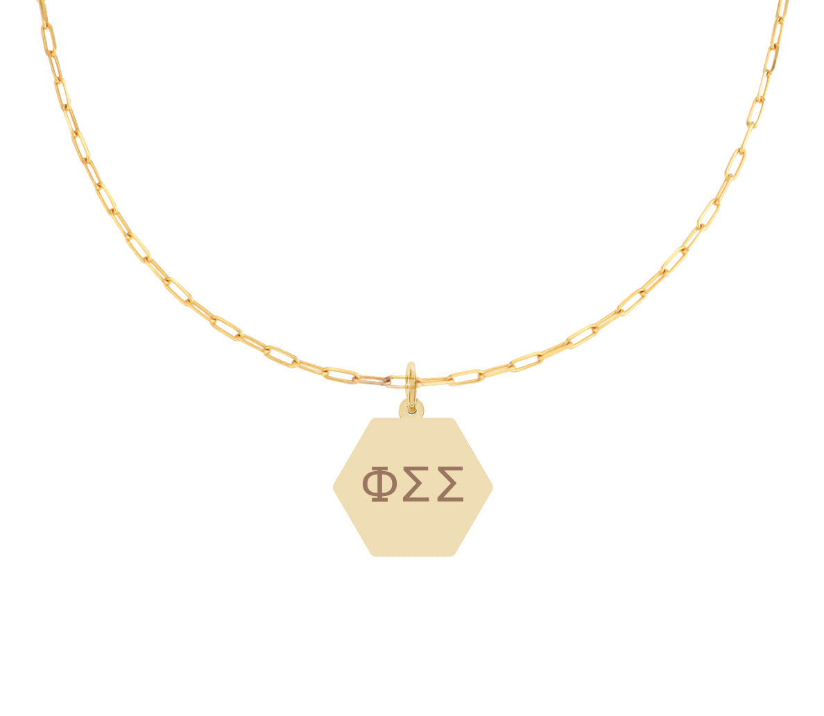 The perfect gift of Sisterhood! Our Paperclip Style Chain Sorority Necklace features your sorority's Greek letters on a 15mm hexagon shaped pendant, with a paperclip style chain, all dipped in 18K Champagne gold! Perfect for a bid day gift, big little gift or a treat for yourself!
