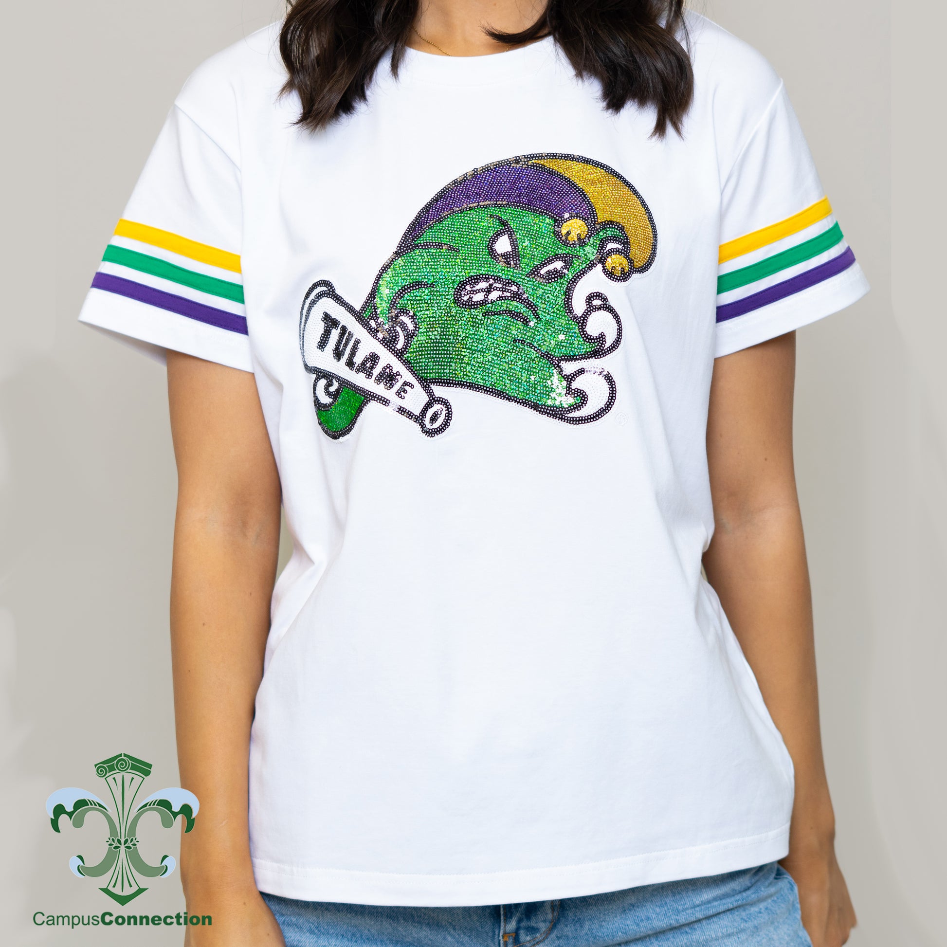 Tulane Mardi Gras Jester Wave Sequin Stripe Tee